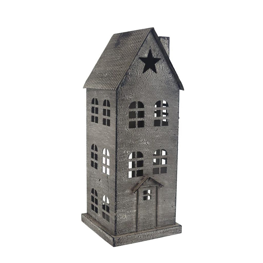 Dekorační domeček na svíčku. Rozměry : 15 × 15 cm, výška 38,5 cm. Barva : šedo hnědá. Materiál : kov.