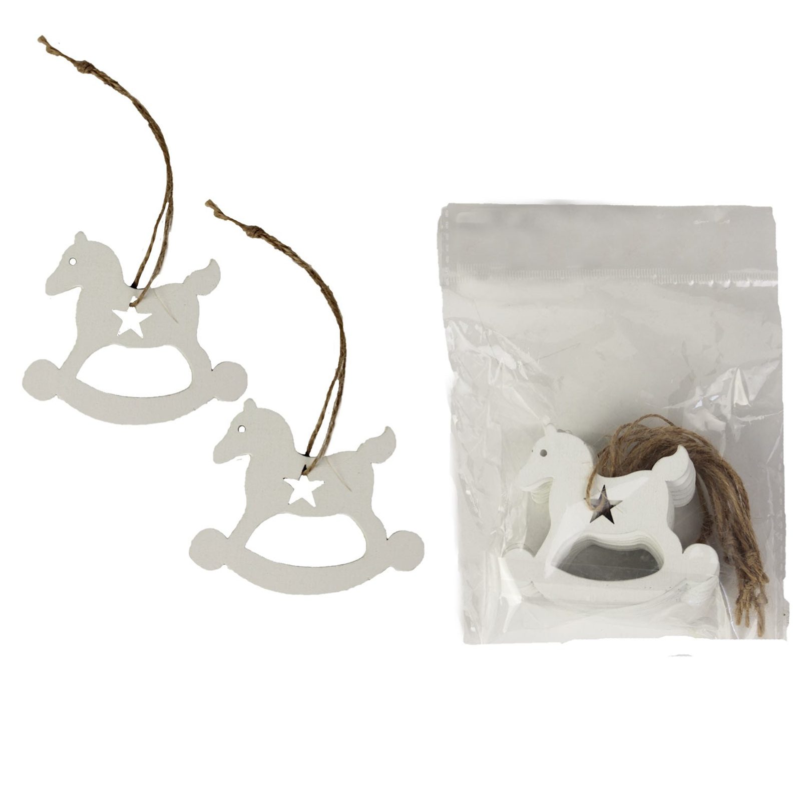 Sada dekoračních koníků k zavěšení. Sada obsahuje 10 koníků. Rozměry : 7 x 0,2 cm, výška 6 cm. Barva : bílá. Materiál na bázi dřeva.
