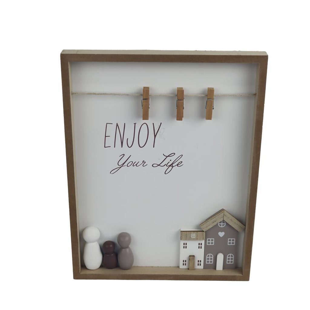 Dekorační rámeček na fotky s kolíčky. Rozměry : 22 × 23 cm, výška 28 cm. Barva : kombinace bílá, hnědá, šedá. Materiál na bázi dřeva.