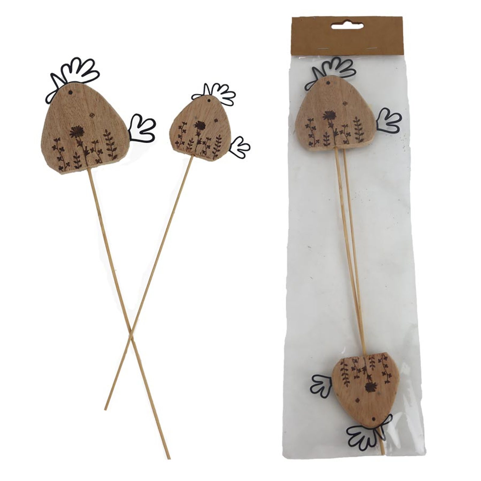 Sada dekoračních zápichů slepička. Sada obsahuje 2 zápichy o dvou velikostech. Rozměry : 6,5 - 9 x 6,5 - 9 cm, tloušťka 0,7 cm, celková výška 26 - 33 cm.