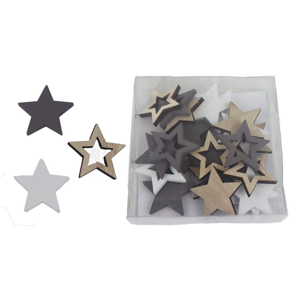 Sada dekoračních hvězdiček. Sada obsahuje 24 hvězdiček. Rozměry : 3,4 x 3,4 cm, tloušťka 0,3 cm. Barva : kombinace hnědá, šedá, bílá. Materiál na bázi dřeva.