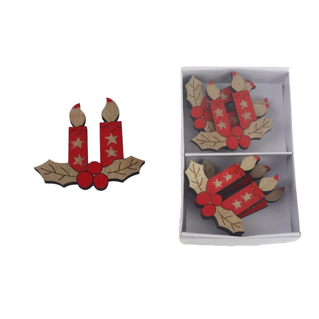 Sada dekorací ve tvaru svíčky. Sada obsahuje 6 dekorací. Rozměry : 5,5 x 0,5 cm, výška 5,3 cm. Barva : kombinace přírodní s červenou. Materiál na bázi dřeva.