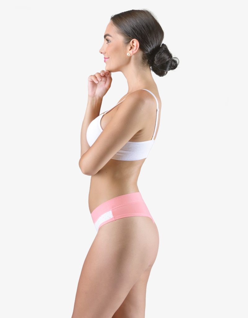 Boková tanga francouzského střihu se širokým bokem, dámské šité prádlo. Pasový kraj je začištěný širším lemem ze stejného materiálu. Nohavičky jsou začištěné úzkým lemem ze stejného materiálu. Přední díl je potištěný. Zadní díl a lemy jsou jednobarevné.