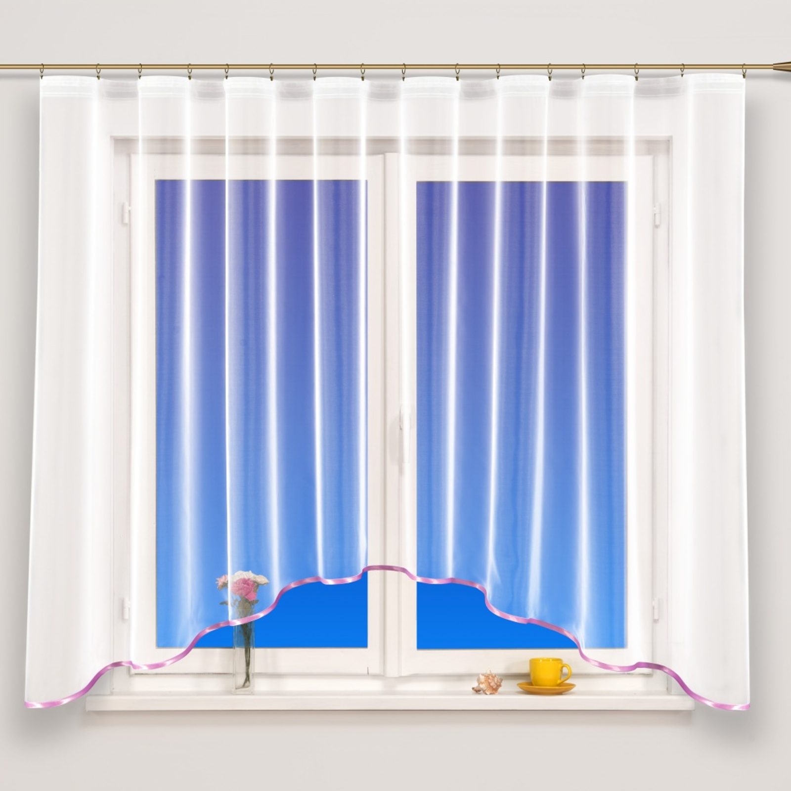 Hladká bílá voálová záclona zakončená taftovou stuhou různých barev. Záclona je opatřena průhlednou řasící stuhou s poměrem řasení 1:2 pro zavěšení na háčky či žabky. Elegantní voálová záclona se dobře doplňuje s výraznější dekorační látkou.