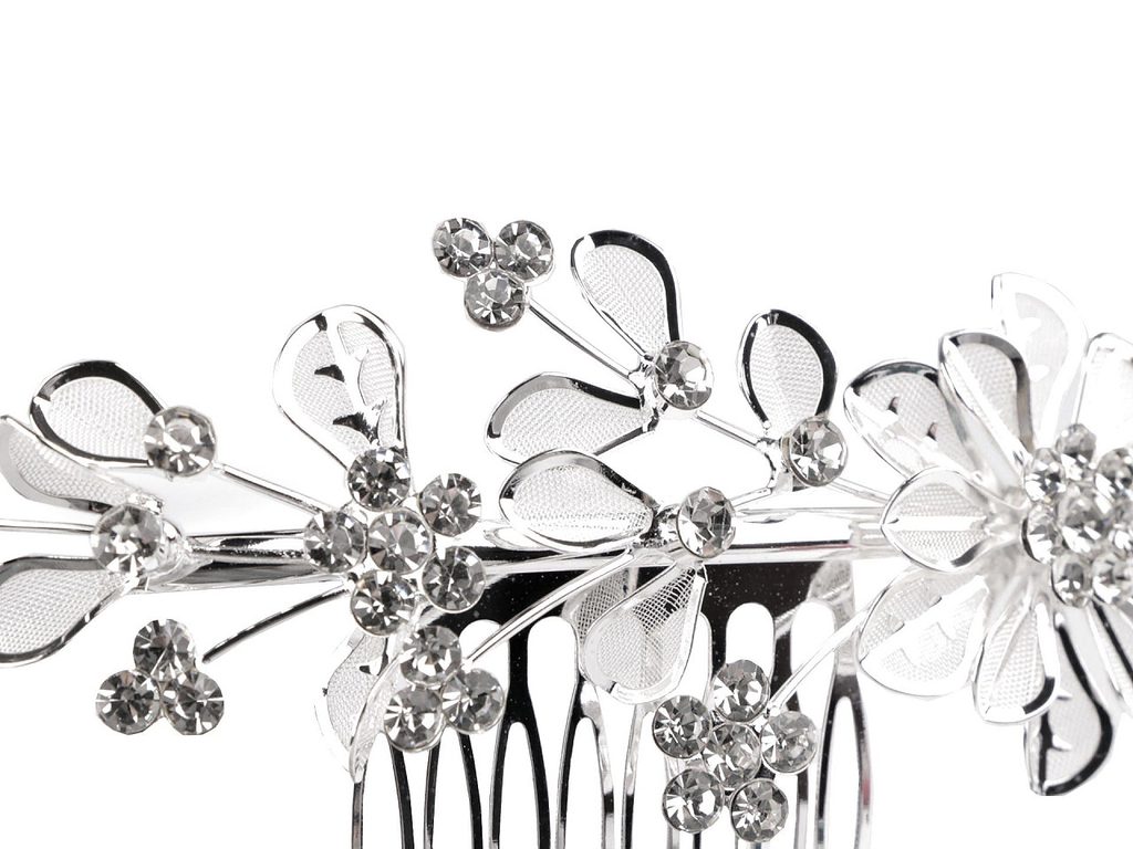 Kovový hřeben do vlasů s kovovým květem s větvičkou je ozdobený broušenými kamínky, díky kterým se poutavě třpytí. Oslní na každé slavnostní události ve společenském účesu, ale je vhodný i na běžné nošení. Samotný hřeben je rovný, ozdoba je jemně prohnutá. V účesu hřeben pevně drží.