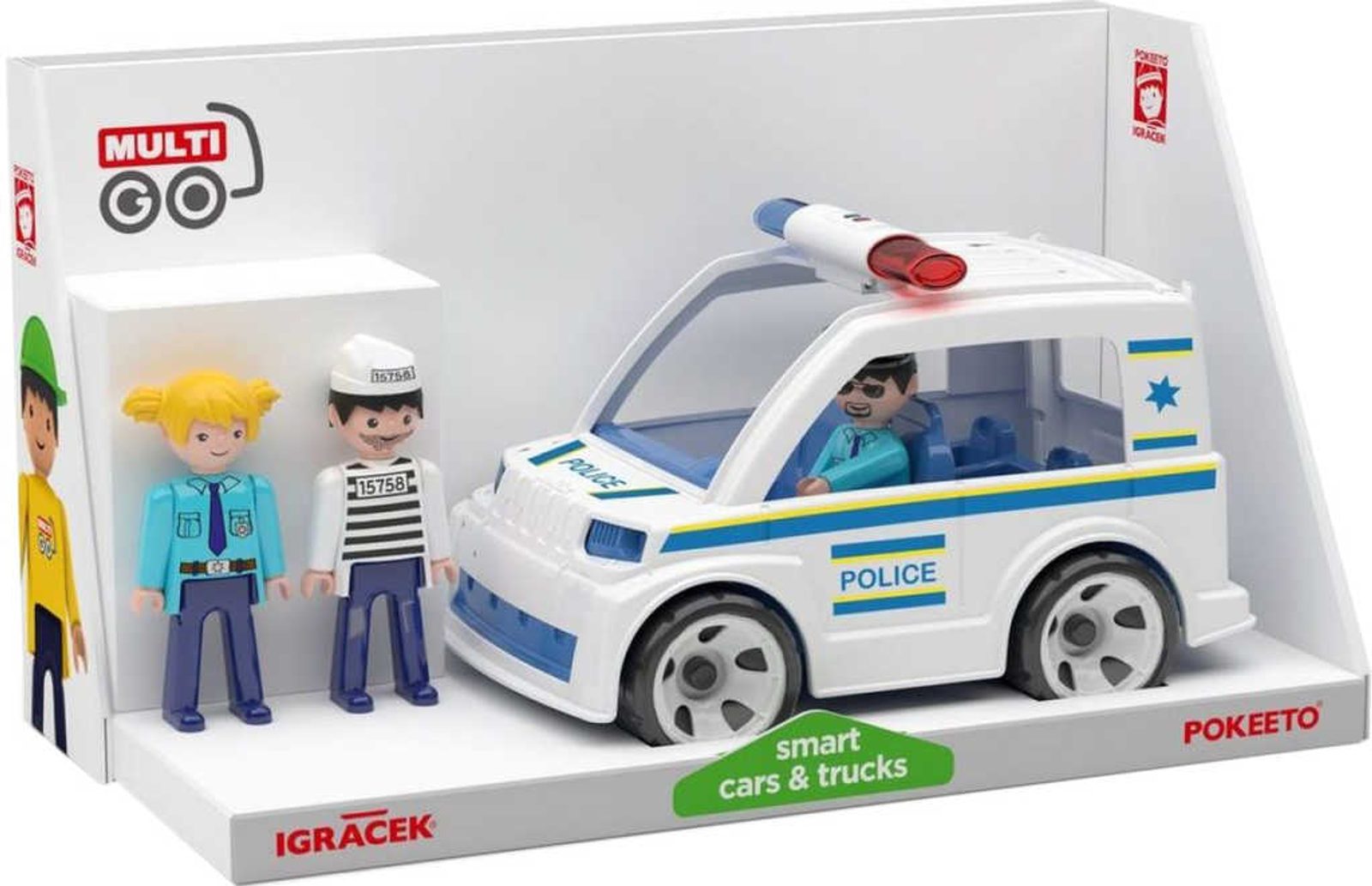 Superrychlé policejní auto s nebojácnou posádkou policistů nedá šanci na únik žádnému darebákovi. Herní set z kolekce Igráček MultiGo s autíčkem a třemi postavičkami.