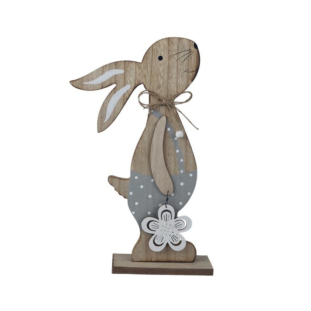 Dekorační zajíc. Rozměry : 19 × 5 cm, výška 30 cm. Barva : kombinace přírodní s šedou. Materiál na bázi dřeva.