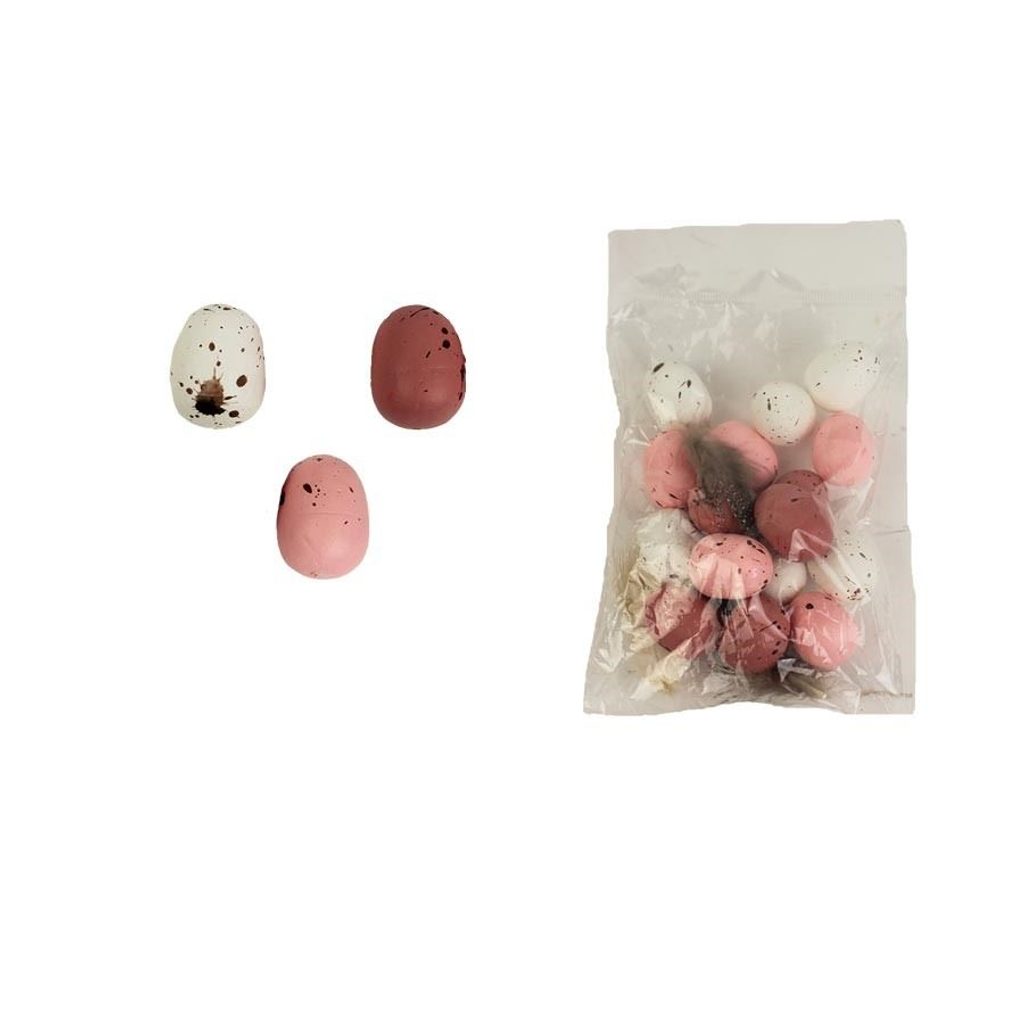 Sada dekoračních vajíček. Sada obsahuje 12 vajíček. Rozměry : průměr 2,5 cm, výška 3 cm. Barva : kombinace růžová, bílá. Materiál : polystyrén.