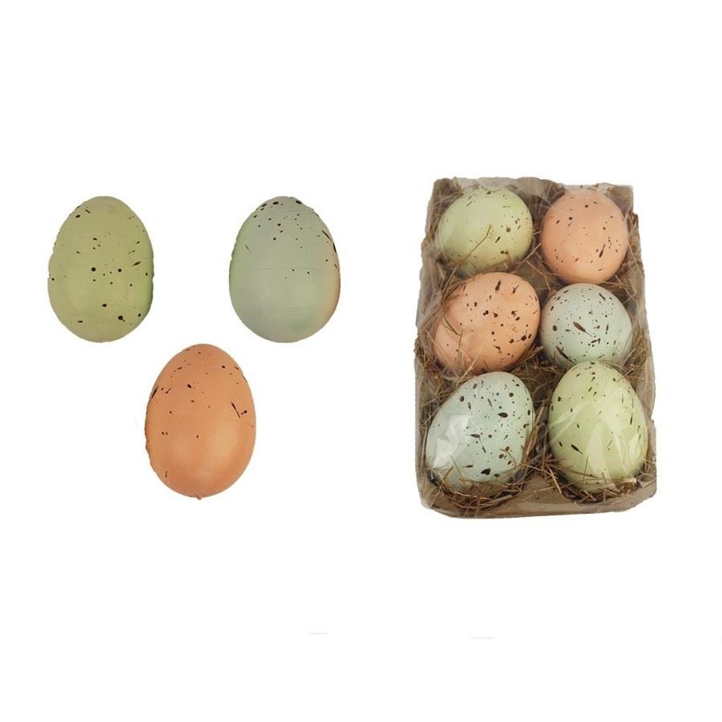 Sada dekoračních vajíček. Sada obsahuje 6 vajíček. Rozměry : průměr 4 cm, výška 6 cm. Barva : kombinace zelená, modrá, růžová. Materiál : plast.