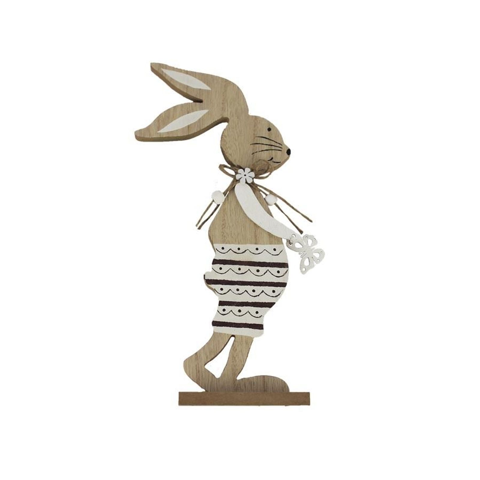 Dekorační zajíc. Rozměry : 15 x 4,5 cm, výška 27 cm. Barva : kombinace přírodní s bílou. Materiál na bázi dřeva.