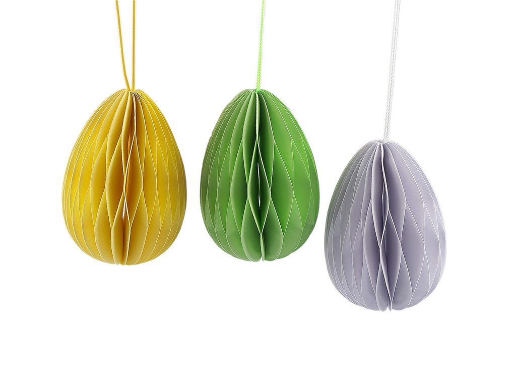 Závěsné vajíčko je vyrobené z plástvového papíru, který při roztažení vytváří efekt připomínající včelí plástve. Tento druh papíru má zajímavý 3D efekt. Díky poutku ho snadno pověsíte na větvičky ve váze, na dekorační věnce apod.