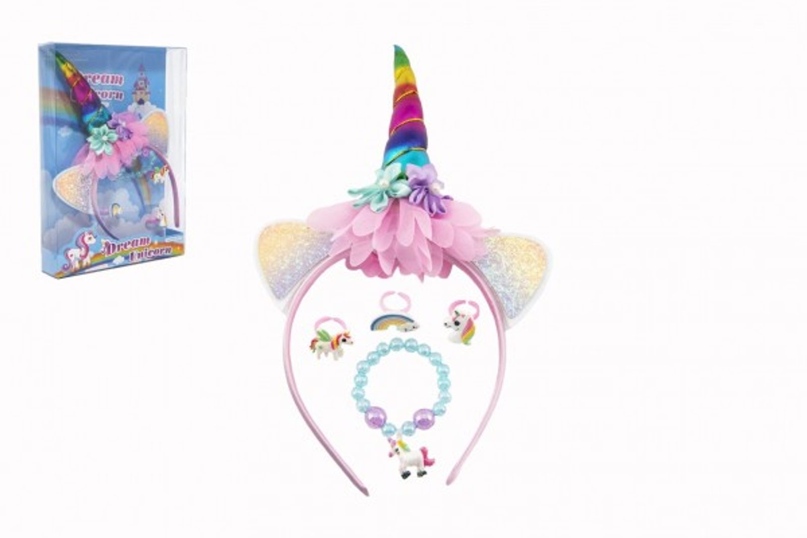 Sada krásy čelenka jednorožec,náramek,prstýnek 3ks plast v krabičce 17,5x25x4cm