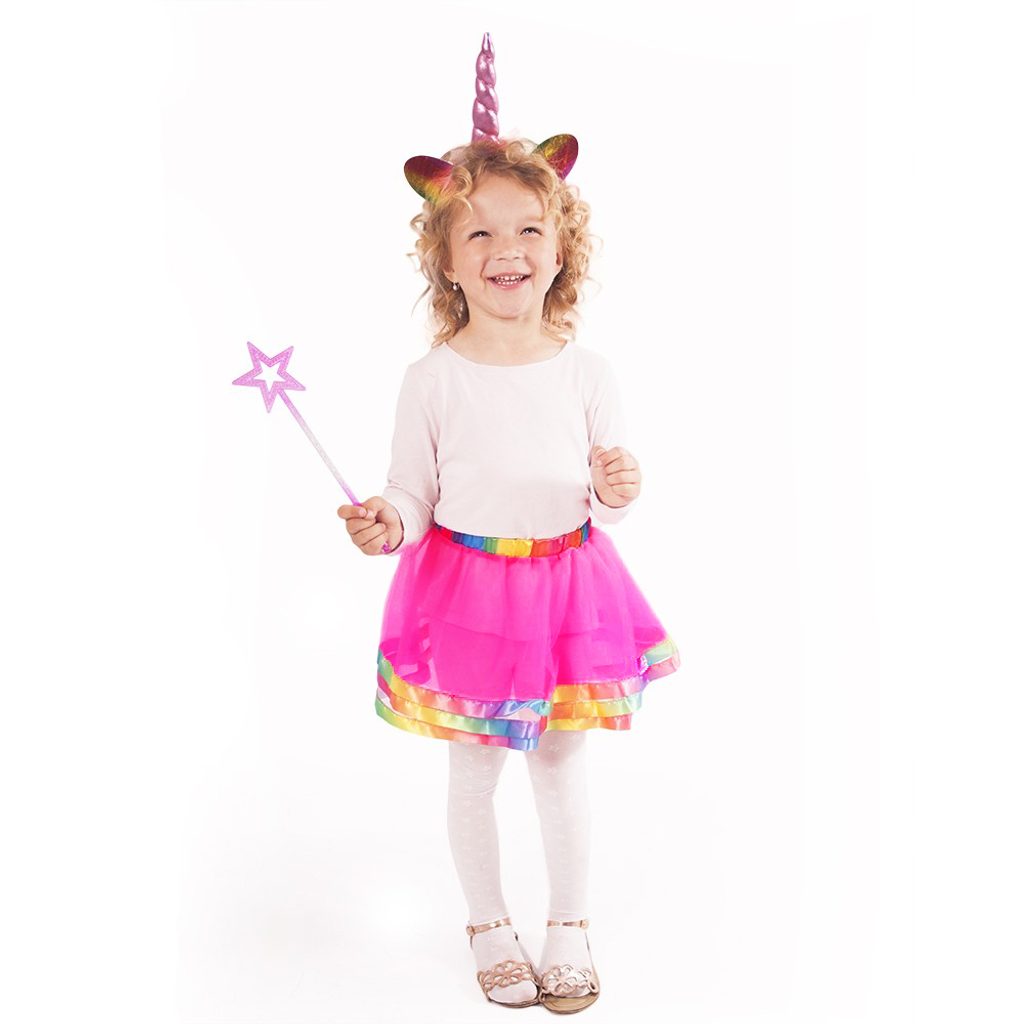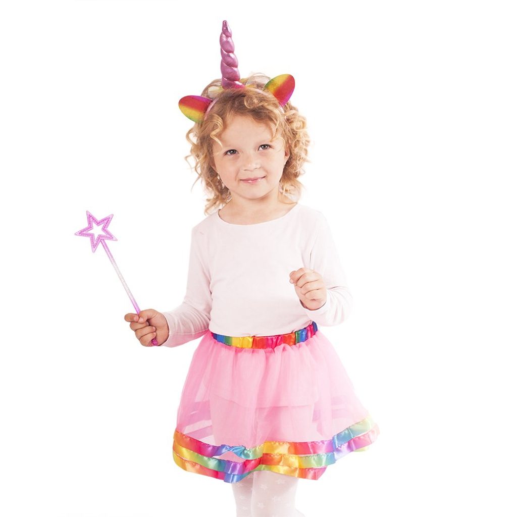 Roztomilá souprava pro všechny malé parádnice! Kostýmek v růžové barvě je určen pro holčičky ve věkovém rozmezí 3-6 let. Balení obsahuje nadýchanou sukničku zdobenou duhovým lemováním, perfektně sladěnou čelenku s rohem jednorožce a také hůlku. Délka sukýnky, která je v pase na gumičku je cca 31 cm.