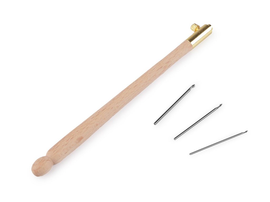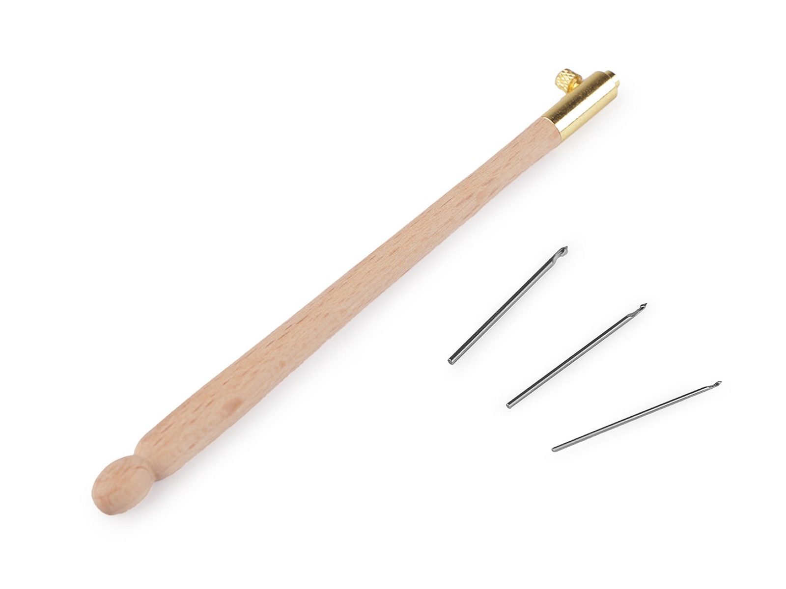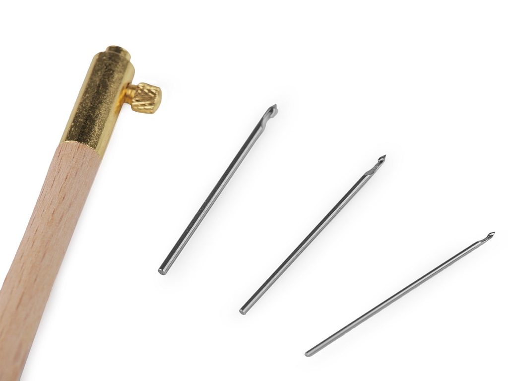 Sada obsahuje dřevěnou rukojeť a tři jehly o tloušťce háčku 0,8 mm, 0,9 mm a 1,1 mm.