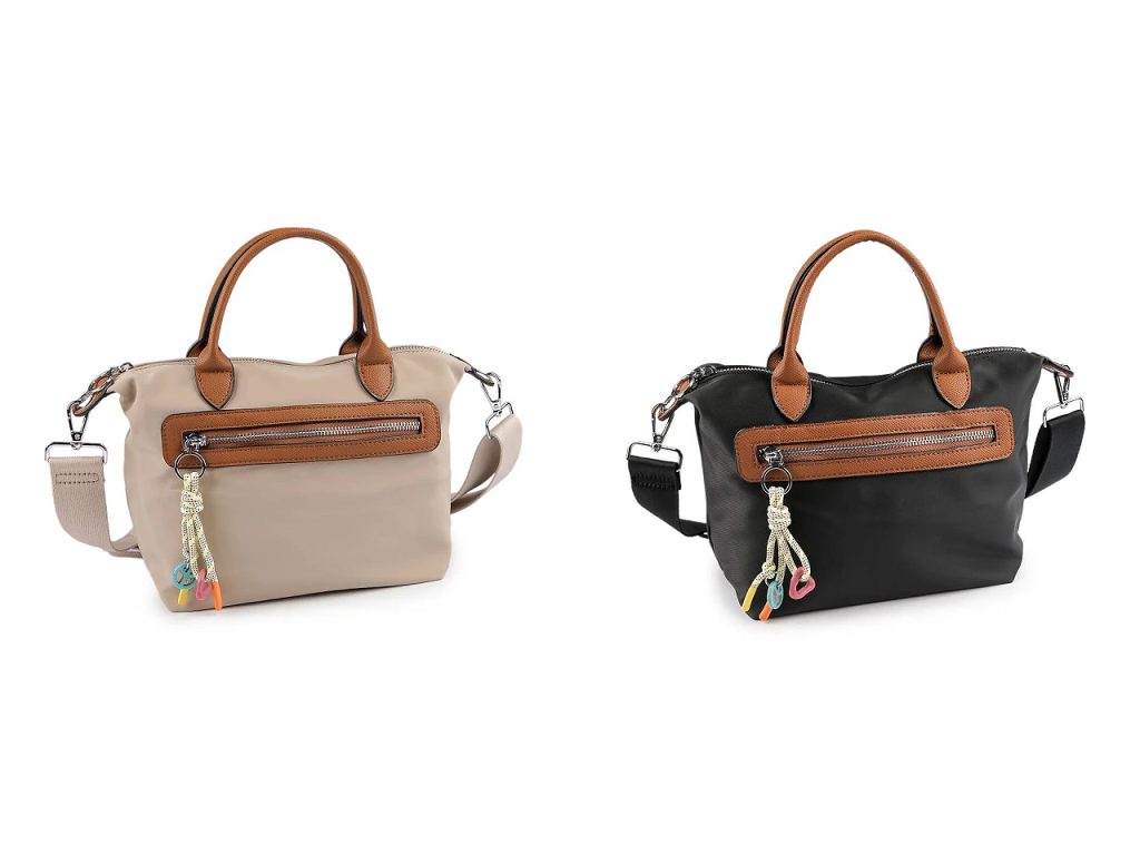 Malá módní kabelka přináší dokonalou kombinaci stylu a funkčnosti. Je ze syntetického materiálu, který vypadá jako textil, má výhodu snadné údržby, kabelku stačí jen očistit vlhkým hadříkem. Zajímavým prvkem je kontrastní lemování, které kabelce dodává jedinečný vzhled. Součástí je také ozdobný přívěsek, který přidává kabelce na osobitosti.