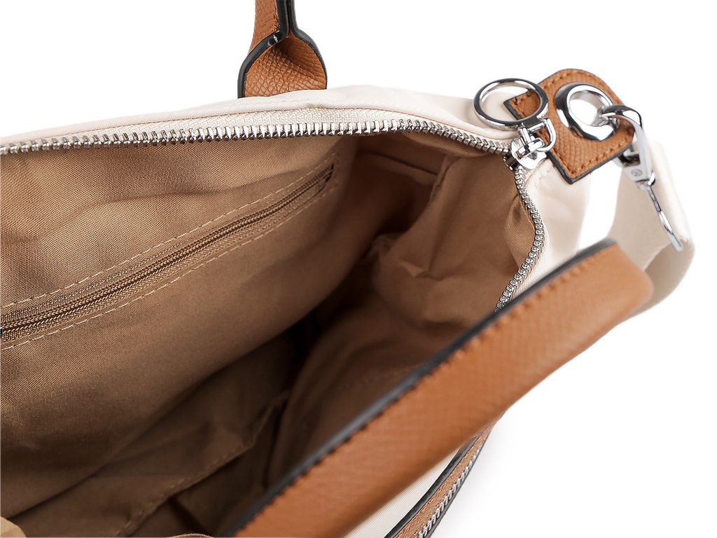 Kabelka se uzavírá na zip. Součástí je i malá vnitřní kapsa na na zip, která slouží k uschování drobných cenností a jedna malá plochá kapsa. Další kapsy na zip jsou na přední i zadní straně kabelky. Součástí kabelky jsou ucha a odnímatelný popruh na karabiny s regulací délky. Kabelku můžete nosit jako crossbody přes rameno či do kříže nebo jen tak v ruce.