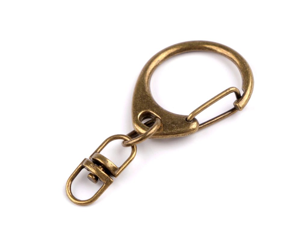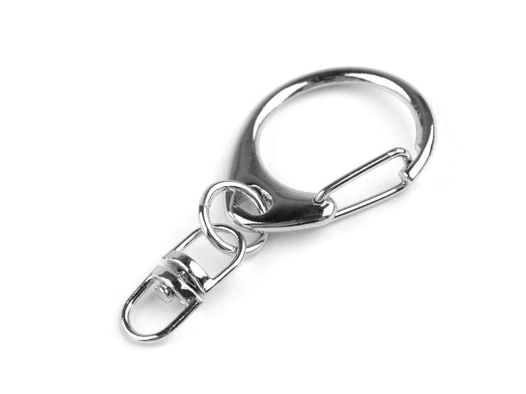 Kovová karabinka je připevněná na otočném obrtlíku. Je vhodná k výrobě klíčenek či různých přívěsků na tašky, kabelky, batohy apod.