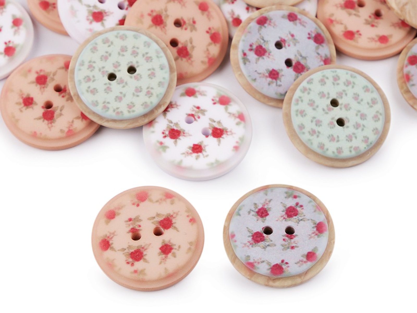 Dvoudírkové knoflíky jsou z jedné strany ozdobené motivem květin. Zadní strana imituje kámen (může připomínat i řez minerálem). Knoflíky vyniknou na oděvech, taškách, dekoračních polštářích, přáníčkách, pozvánkách apod.