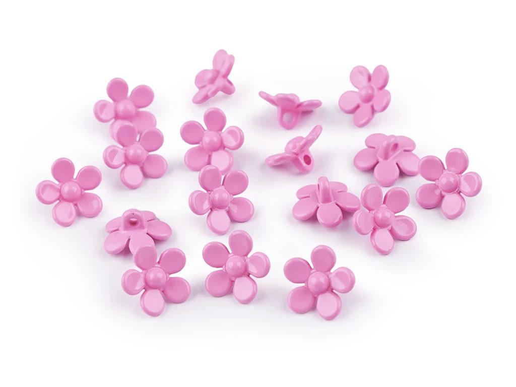 Plastové knoflíky nebo korálky upoutají pozornost tvarem květu. Mají spodní přišívání. Můžete je našít na dívčí halenky, šaty, svetry apod. Vyniknou i jako dekorace tašek, pytlíků, čelenek do vlasů či kapsářů. Dají se přišívat vlnou.