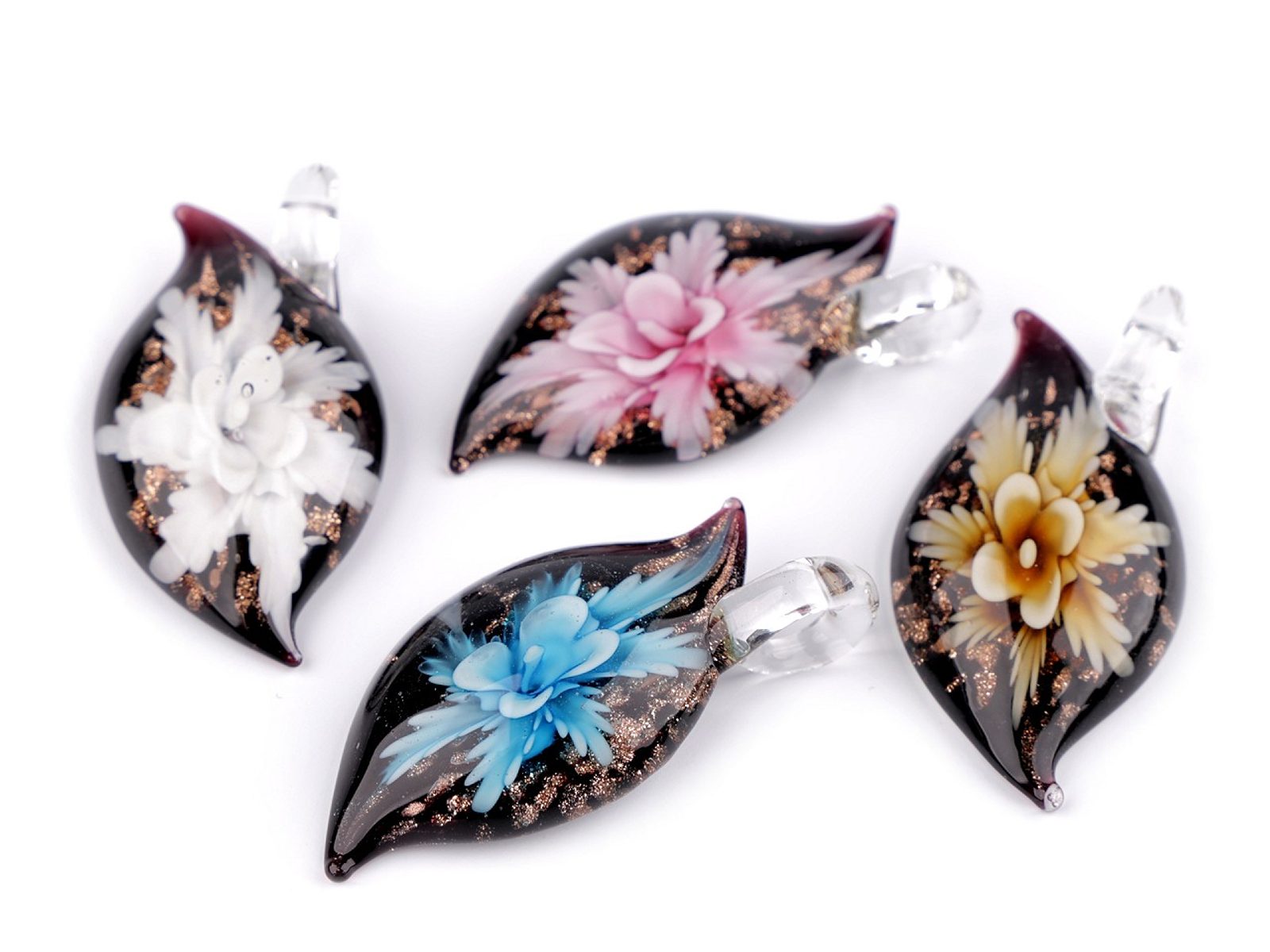Přívěsky jsou vyrobené ze skla, uvnitř mají nádherně probarvený květ. Okolo je květ jemně dozdobený glitry. Zadní strana přívěsku je plochá. Na krk si můžete přívěsek pověsit na řetízek nebo kůži díky velkému praktickému oušku.