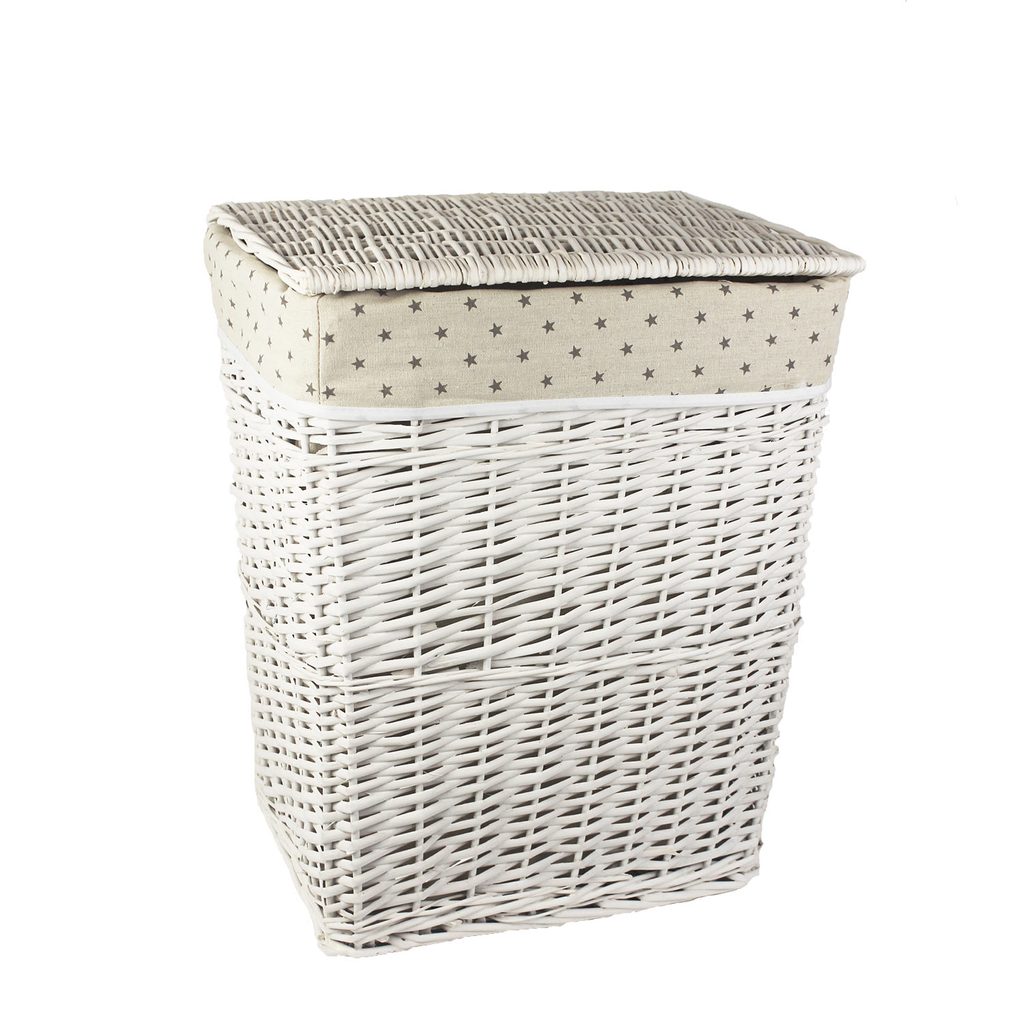 Velice pěkný koš na prádlo moderního designu. Koš má rozměry 46 x 35 cm, výšku 57 cm. Barva : bílá. Materiál : proutí, látka.