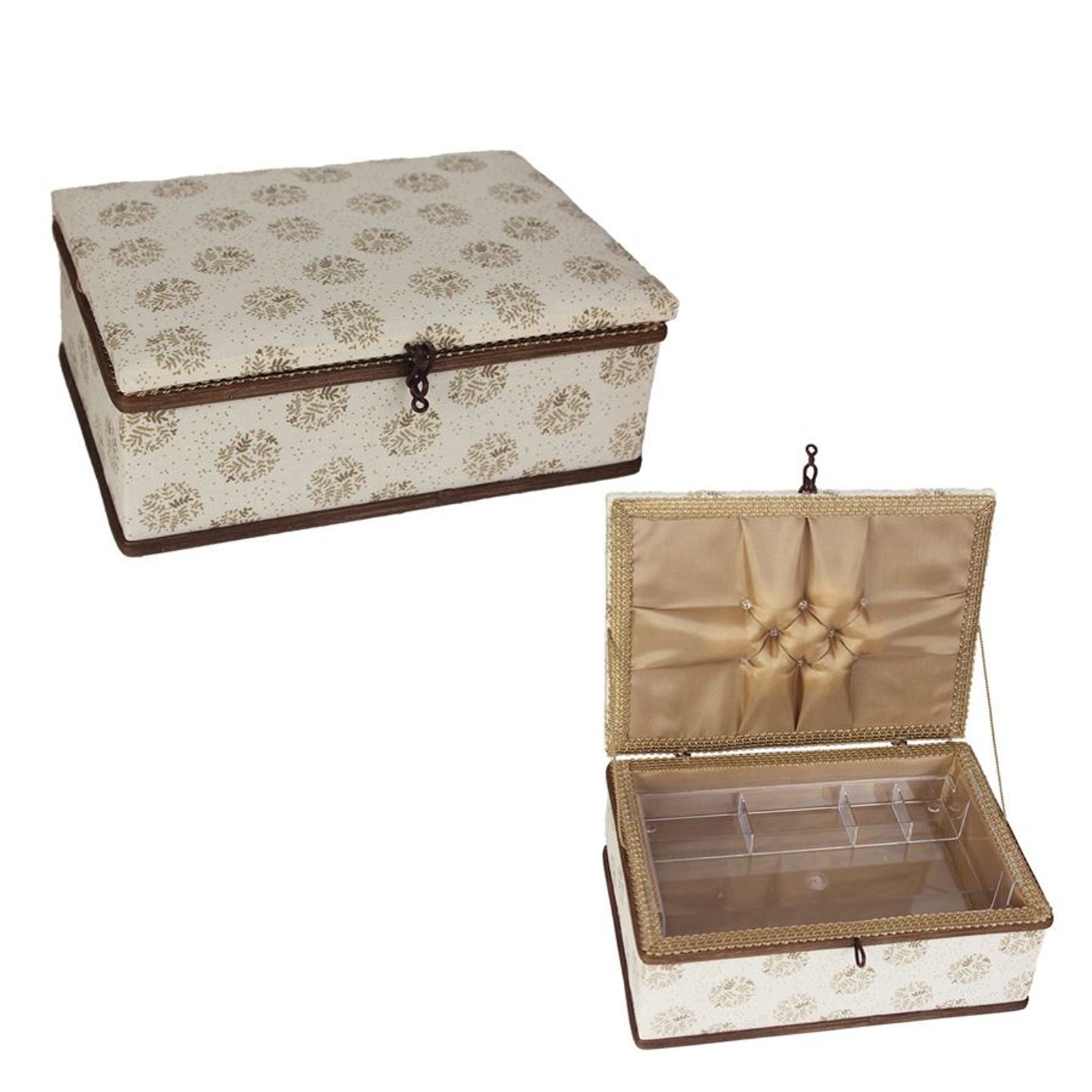 Kazeta s přihrádkou vám pomůže přehledně uložit všechny vaše šicí potřeby. Uvnitř se nachází odnímatelné patro z průhledného pevného plastu, které má čtyři menší přihrádky a dvě větší. Na vnitřní straně víka je jehelníček. Kazeta má okraj z bambusu ozdobený prýmkem. Víko je látkové.