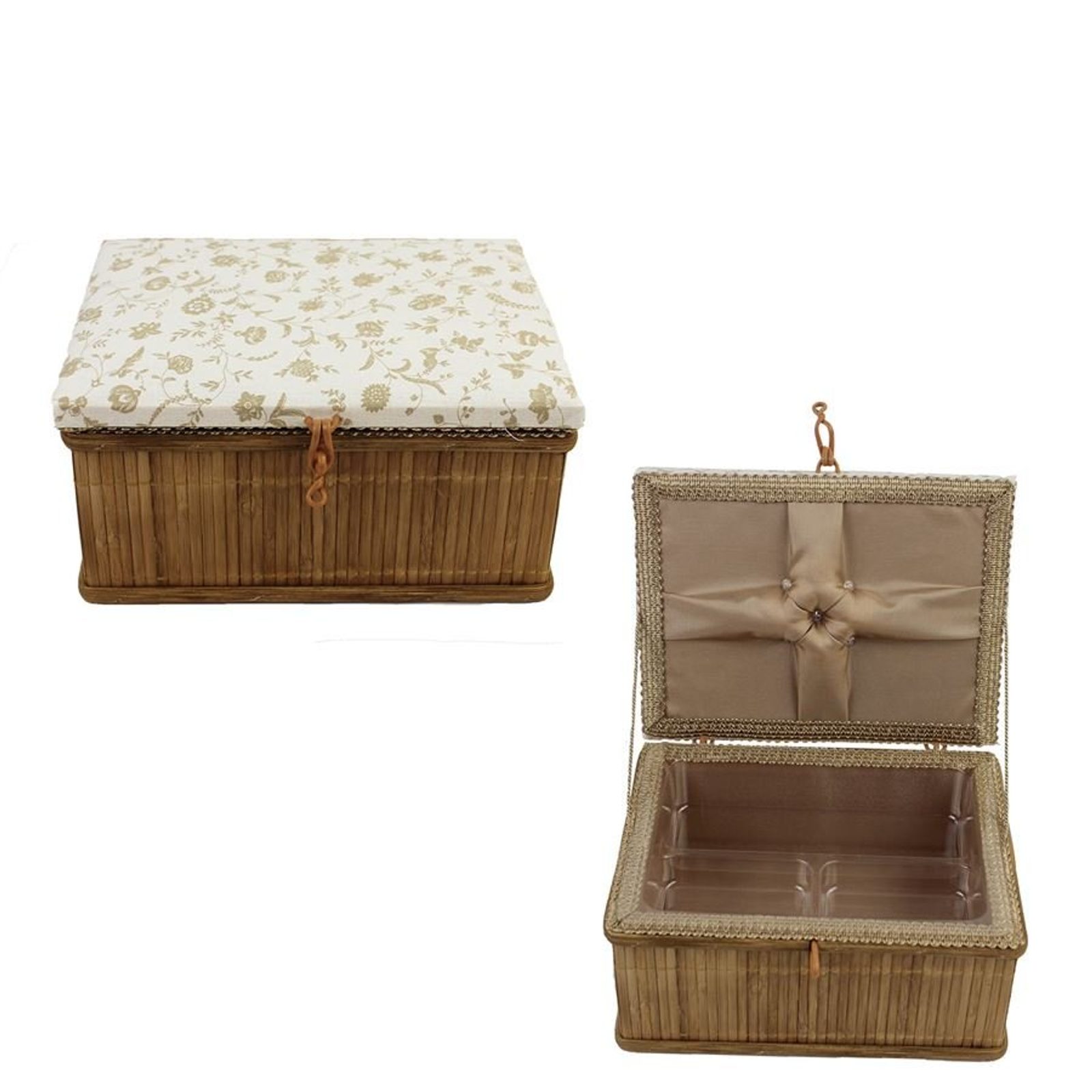 Kazeta na šicí potřeby z bambusu, víko potaženo látkou, plastová vložka uvnitř.