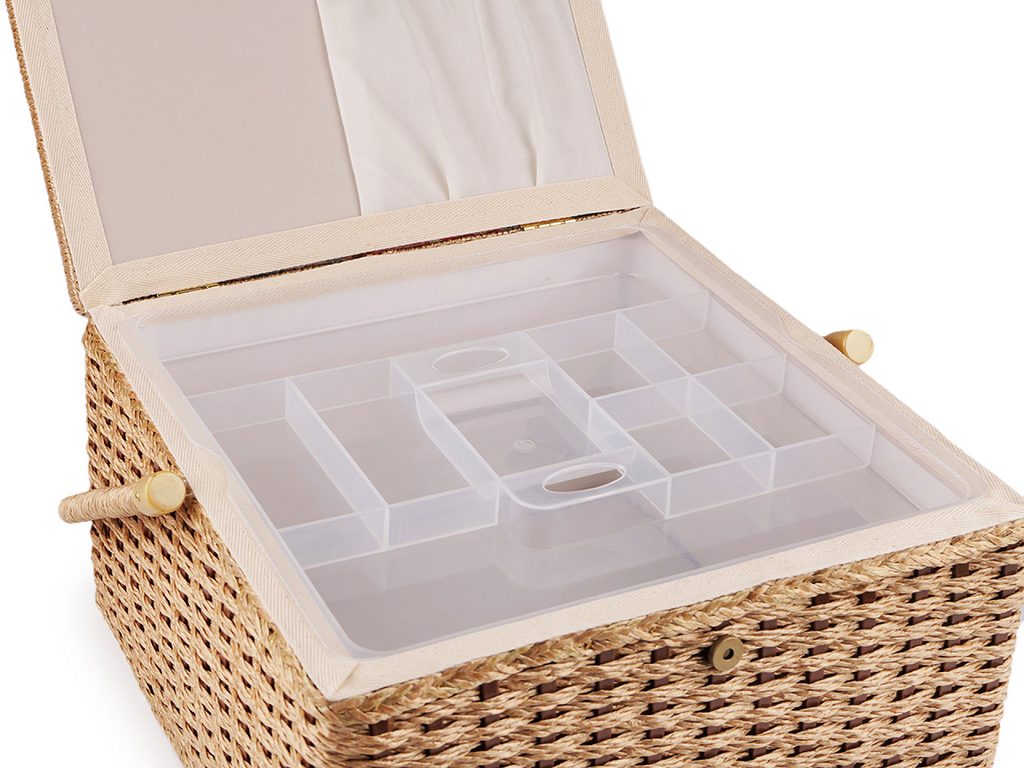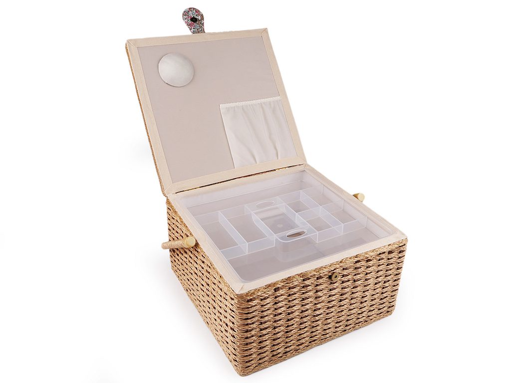 Velký čalouněný košík na šicí potřeby ocení každá švadlenka. Horní potah s květy připomíná gobelín. Na vnitřní straně víka má košík jehelníček a kapsu. Dále má k dispozici plastové mezipatro se spoustou přihrádek, do kterých si lze šicí potřeby uspořádat. Patro se dá snadno vyjmout. Výška mezipatra je 3 cm. Košík má zapínání na magnet. Díky kvalitnímu pevnému uchu jej můžete snadno přenést.