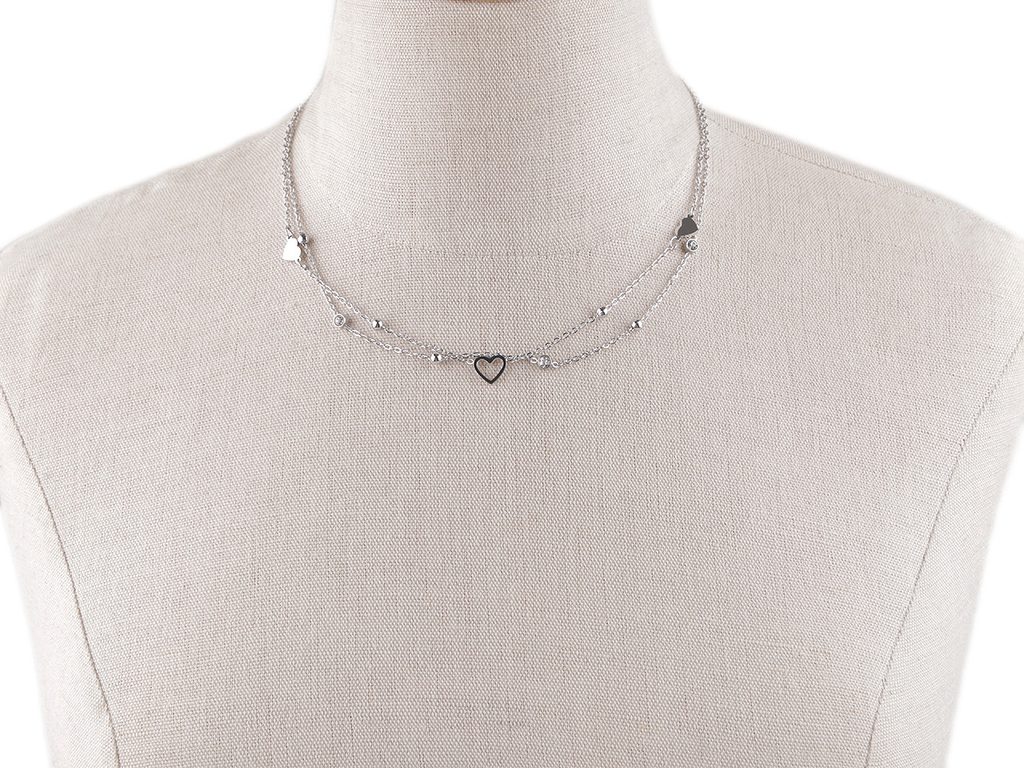 Dvojitý náhrdelník se srdíčky a broušenými kamínky je vyrobený z kvalitní nerezové oceli. Zajímavě a decentně dozdobí většinu outfitů. Ozdoby mají zrcadlový lesk, na řetízcích jsou pevně připojené.