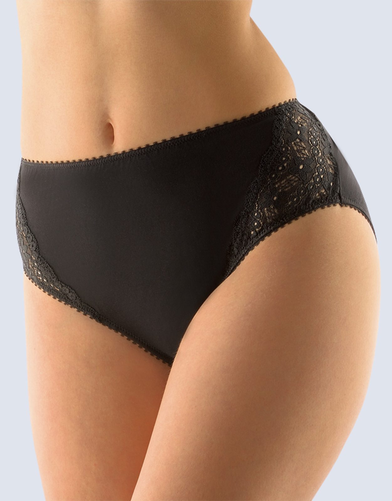 kalhotky klasické ve větších velikostech, větší velikosti, šité, s krajkou, jednobarevné značky GINA, kód 11055. Složení: 92% Bavlna 8% Elastan.