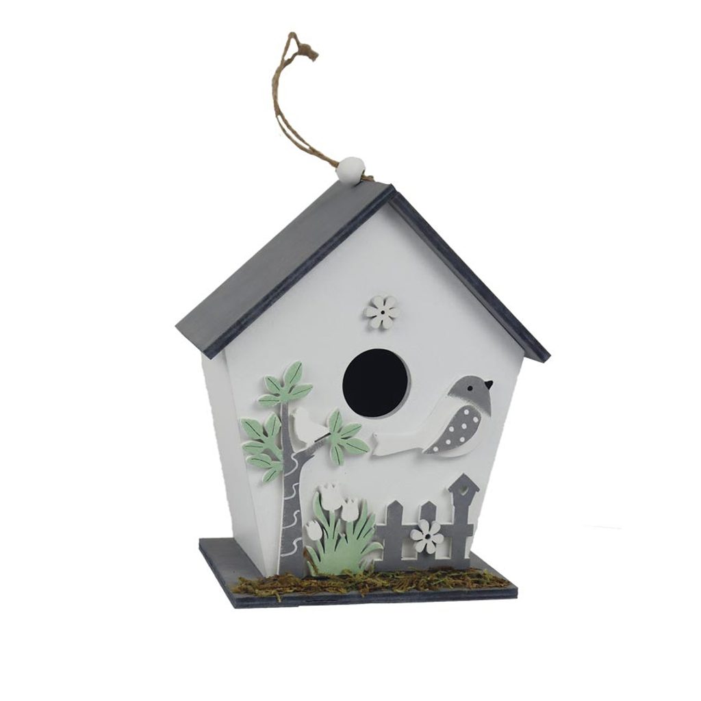 Dekorační budka k zavěšení. Rozměry : 14,5 × 9 cm, výška 17 cm. Barva : kombinace šedá s bílou. Materiál na bázi dřeva.