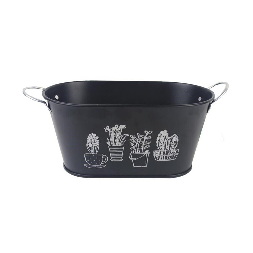 Plechový květináč. Rozměry : 22,5 x 13 cm, výška 10,5 cm, celková výška s uchy 12,5 cm. Barva : černá. Materiál : kov.