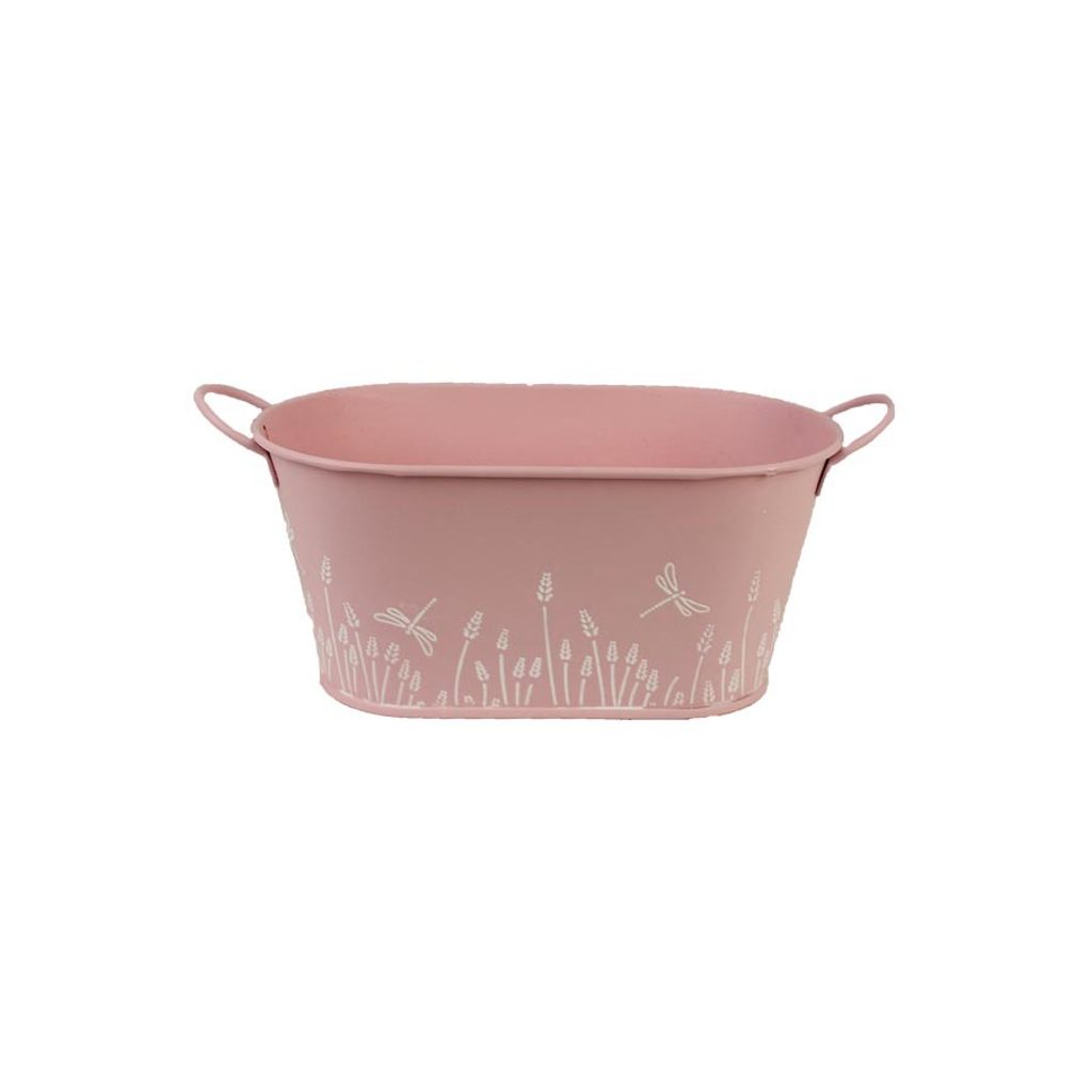 Plechový květináč. Rozměry : 22,5 x 13 cm, výška 11 cm, celková výška s uchy 12 cm. Barva : kombinace růžová s bílou. Materiál : kov.