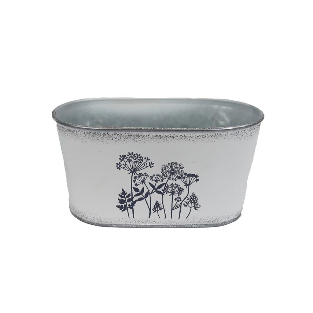 Květináč plechový oválný. Rozměry : 20 × 12 cm, výška 10 cm. Barva : kombinace bílá, černá. Materiál : kov.
