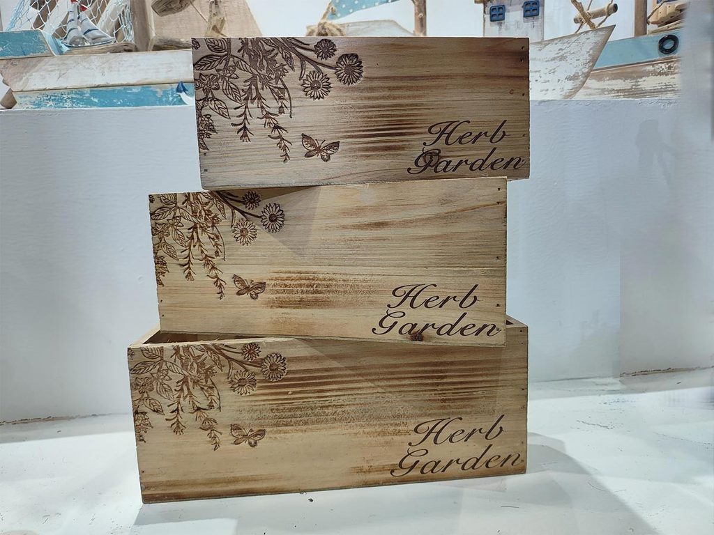 Sada dřevěných obalů s plastem. Sada obsahuje 3 obaly o třech velikostech. Malý obal má rozměry : 21 × 11,5 cm, výšku 8,8 cm. Střední obal má rozměry : 24 × 14.5 cm, výšku 10 cm. Velký obal má rozměry : 27 × 17,5 cm, výšku 11 cm.