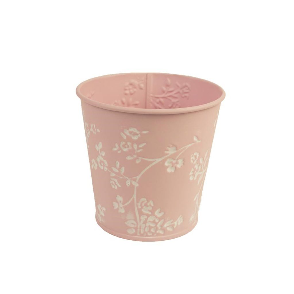 Krásný kovový obal s kytičkami. Obal má průměr 11 cm, výšku 10,6 cm. Barva : kombinace růžová s bílou. Materiál : kov.