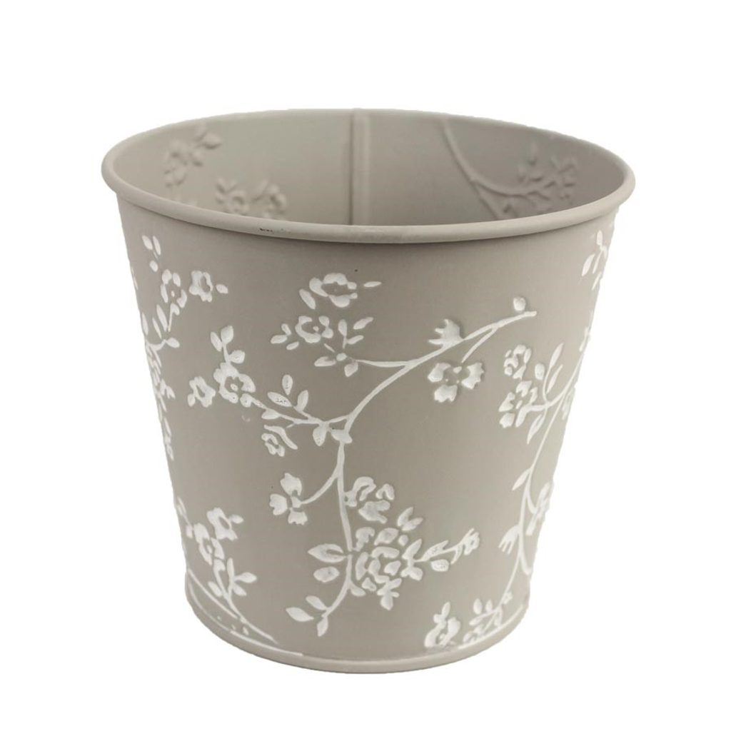Krásný kovový obal s kytičkami. Obal má průměr 15,7 cm, výšku 14,6 cm. Barva : kombinace šedá s bílou. Materiál : kov.