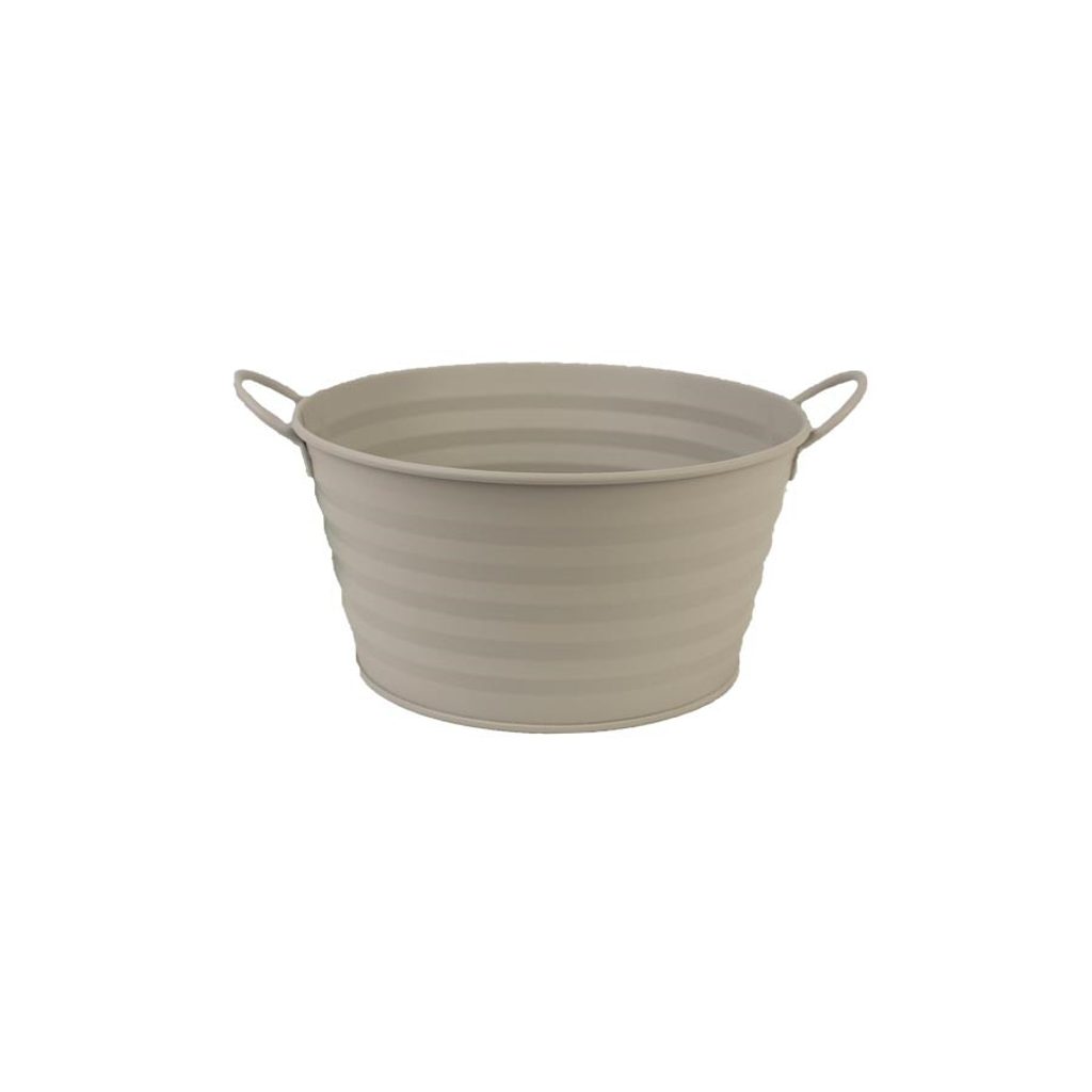 Kovový obal. Rozměry : průměr 19,5 cm, výška 10 cm, celková výška s uchy 11,5 cm. Barva : šedá. Materiál : kov.