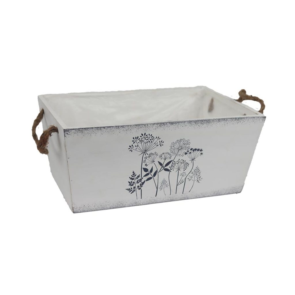 Obal k osázení. Rozměry : 27,5 × 17,5 cm, výška 12 cm. Barva : kombinace bílá, černá. Materiál na bázi dřeva, plast.