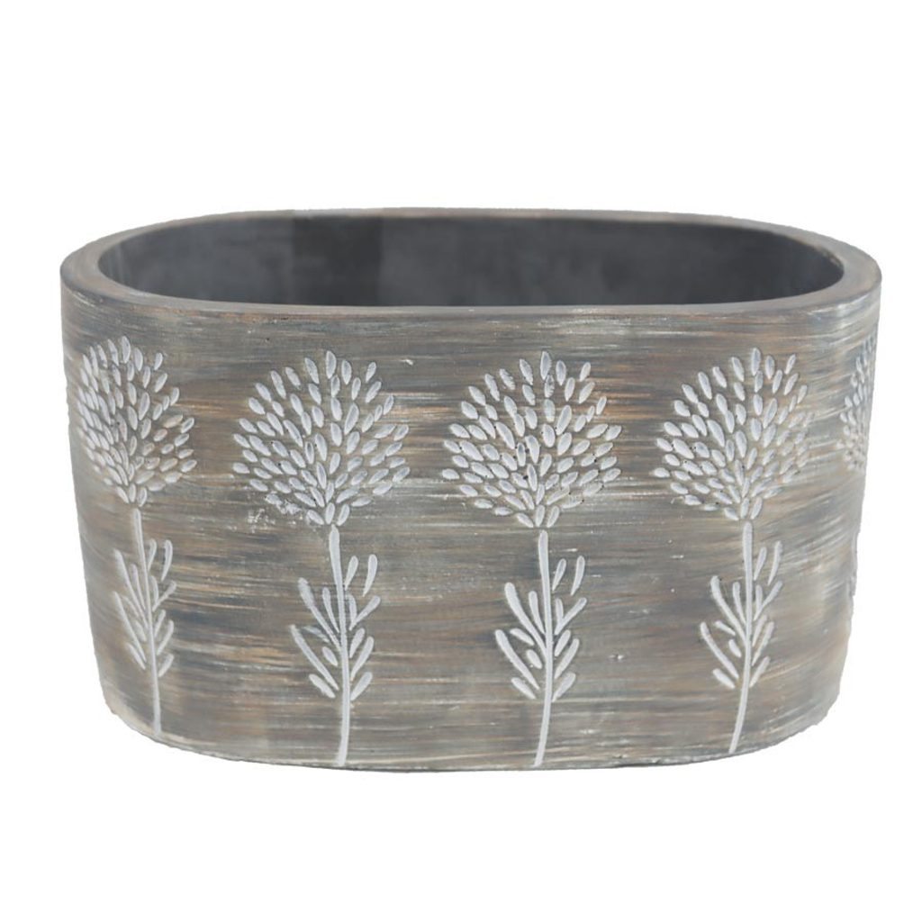 Obal na květiny ovál. Rozměry : 20,5 × 11,5 cm, výška 11 cm. Barva : kombinace šedá, bílá, hnědá. Materiál : beton.