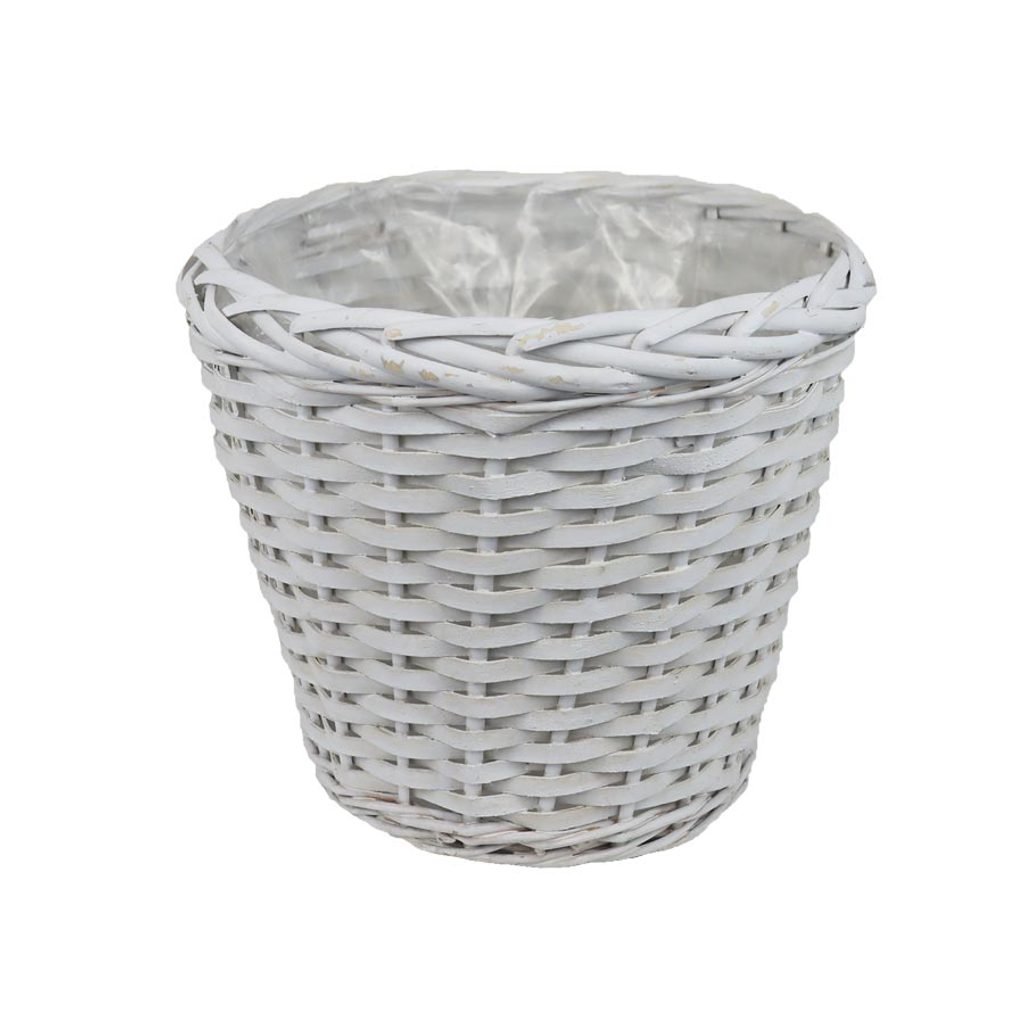 Proutěný obal na květiny s plastem.