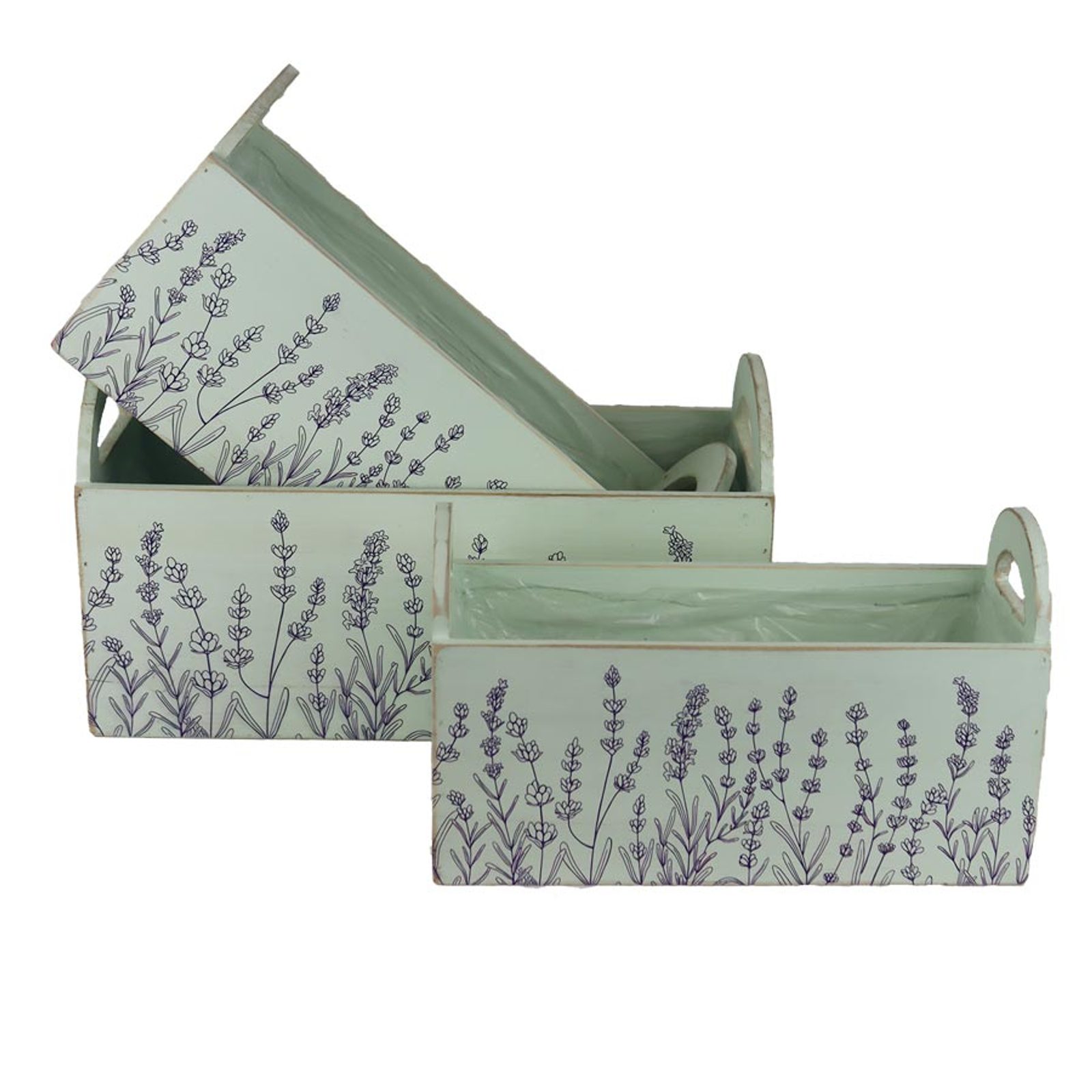 Sada obalů s plastem k osázení. Sada obsahuje 3 obaly o třech velikostech. Malý obal má rozměry : 28 x 11,5 cm, výšku 12 cm, celková výška 16,7 cm. Střední obal má rozměry : 32 x 13,7 cm, výšku 13 cm, celková výška 18 cm. Velký obal má rozměry : 36 x 16,5 cm, výšku 14 cm, celková výška 19,5 cm.