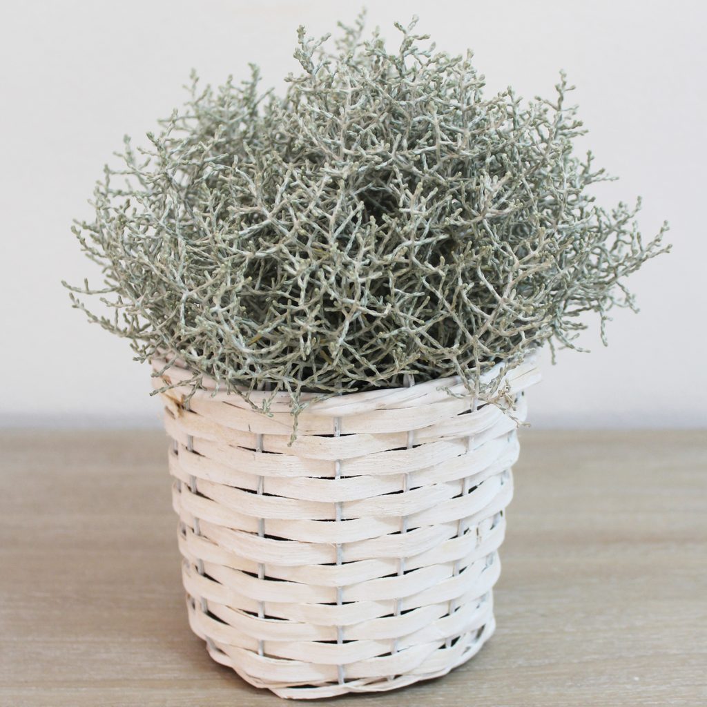 Obal s plastem. Rozměry : průměr 15 cm, výška 12 cm. Barva : bílá. Materiál : proutí, plast.