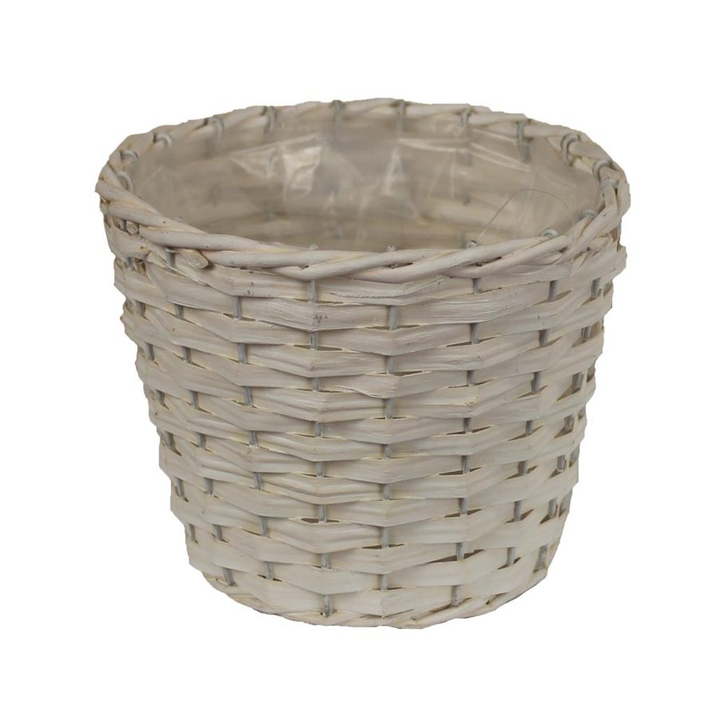 Obal s plastem. Obal má průměr 19 cm, výšku 14 cm. Barva : bílá. Materiál : proutí, plast.