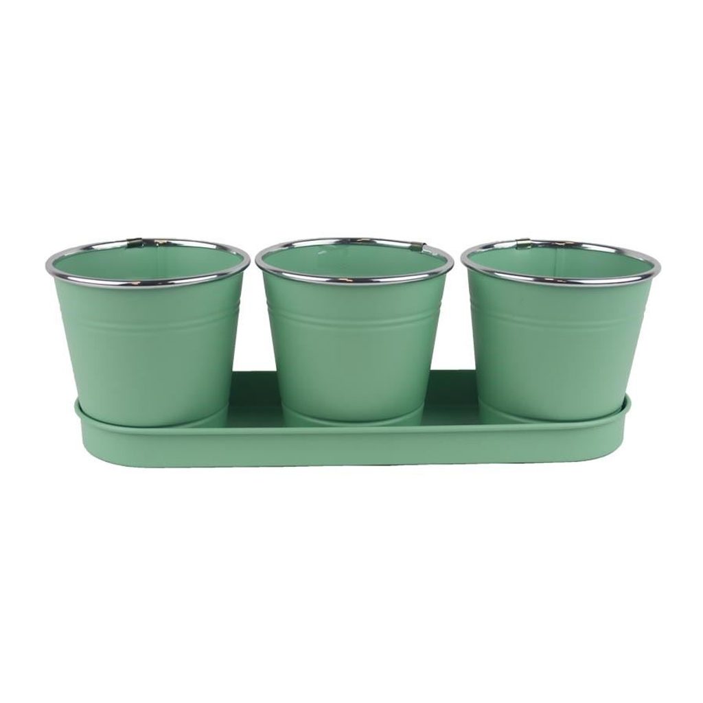 Sada 3 plechových květináčů s tácem. Rozměry květináčů : průměr 11 cm, výška 10,5 cm. Rozměry tácku : 32,5 x 9,8 cm, výška 2,2 cm. Barva : zelená. Materiál : kov.