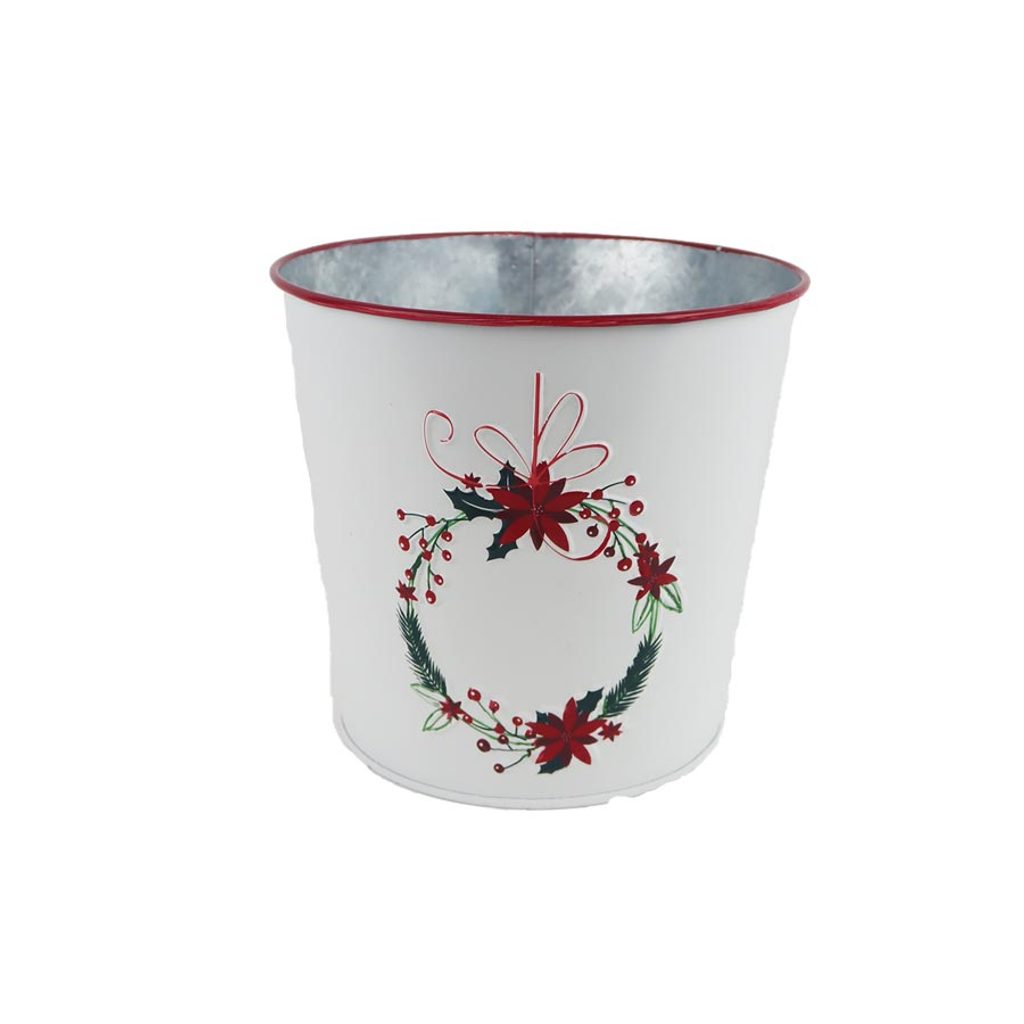Vánoční květináč plechový. Rozměry : průměr 15 cm, výška 13 cm. Barva : kombinace bílá, červená, zelená. Materiál : kov.