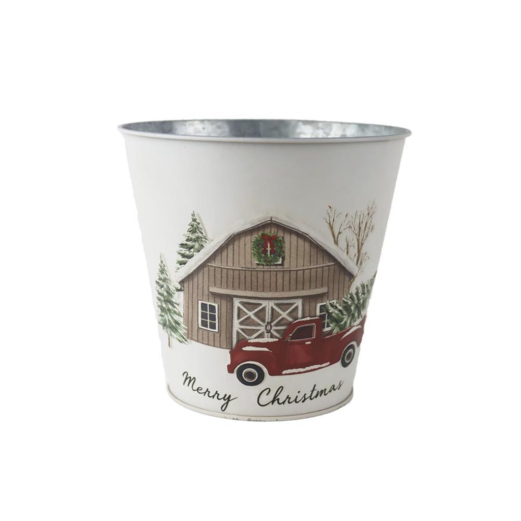 Plechový květináč s vánočním motivem.