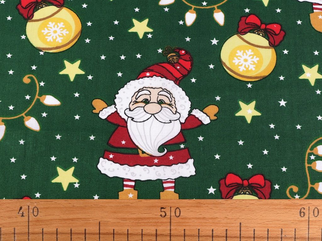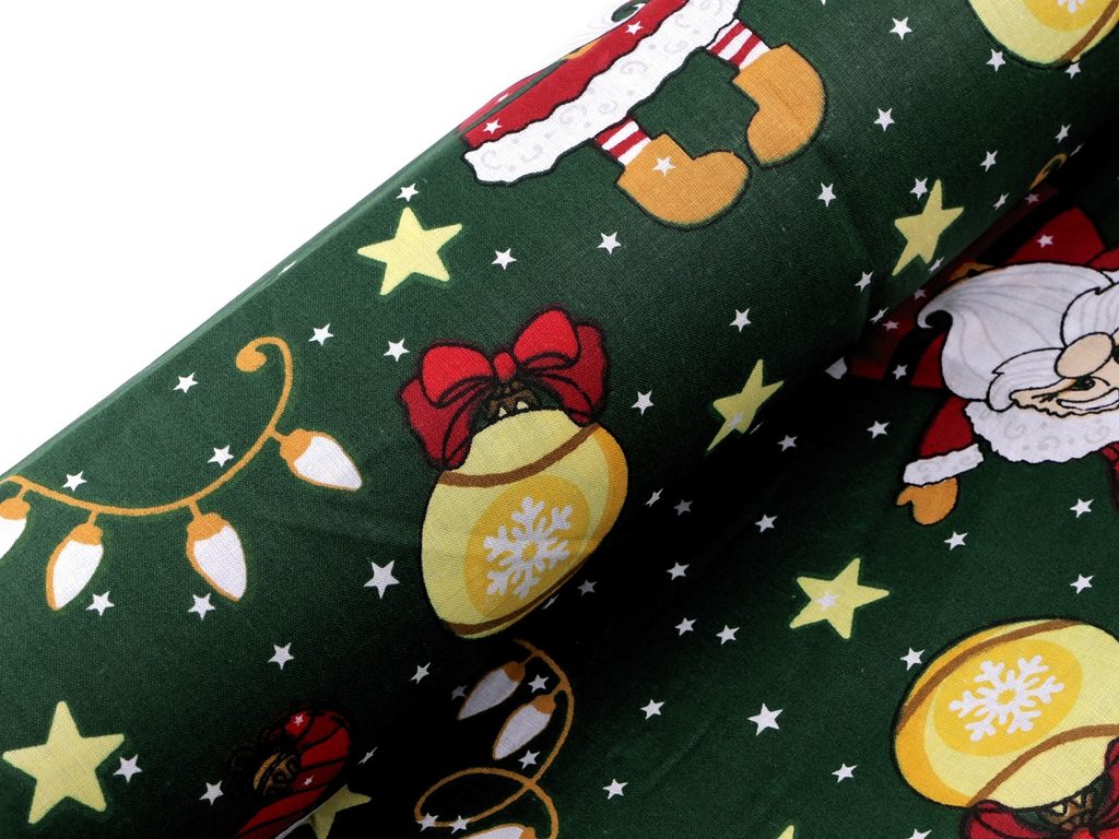 Bavlněnou látku zdobí obrázky s Mikulášem. Díky svému designu se hodí na šití mikulášských pytlíčků a tašek, ale i ubrusů, prostírání nebo povlečení.