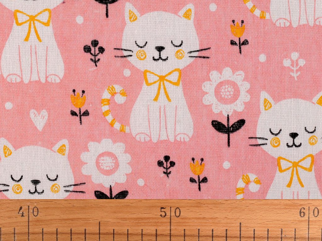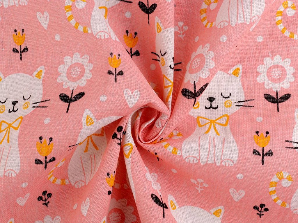 Bavlněná látka s potiskem koček je hrubší, pevná, vhodná na šití tašek, ubrusů, běhounů, prostírání, dekoračních polštářů, dětských teepee apod. Svou plátnovou vazbou připomíná len.