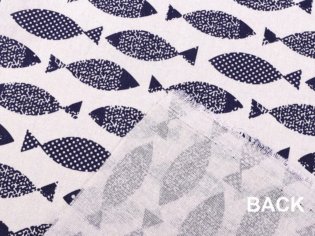 Imitaci lnu zdobí motiv s rybičkami. Je pevná, hrubší. Využijete ji na šití ubrusů, běhounů, prostírání, dekoračních polštářů, tašek, dětských teepee apod.